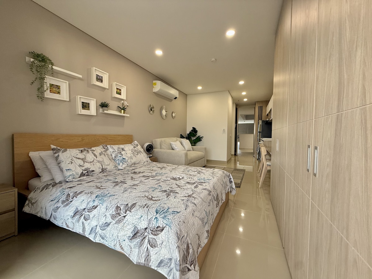 Apartasuite acogedora y funcional, ideal para hasta 3 personas, equipada con cama doble y sofá cama doble, pensada para el descanso y la comodidad. Cuenta con cocina integral, lavadora, baño privado y un balcón con vista, perfecto para disfrutar de momentos tranquilos durante tu estadía.