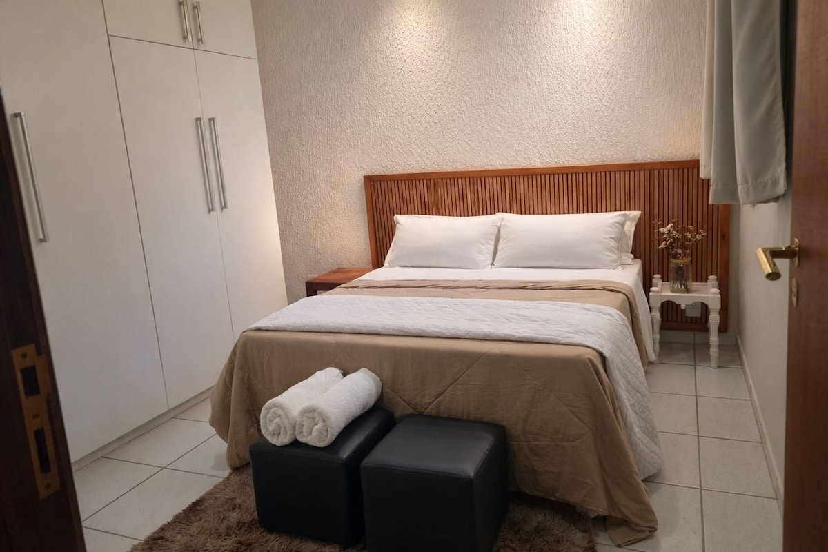 Casa ubicada a 3 minutos de empresas como Intelbras, R&M, Metagal, Magvatech, Cooper Rita y a 10 minutos del centro. La casa tiene 2 dormitorios, uno de ellos una suite, con una cama doble. La otra habitación tiene dos camas individuales. En total, la casa tiene 3 baños. Uno de ellos es externo, junto a la piscina. El garaje es amplio, con un espacio para un máximo de 4 automóviles. Rancho dos Ipês ofrece toallas, mantas y ropa de cama para todos los huéspedes.
