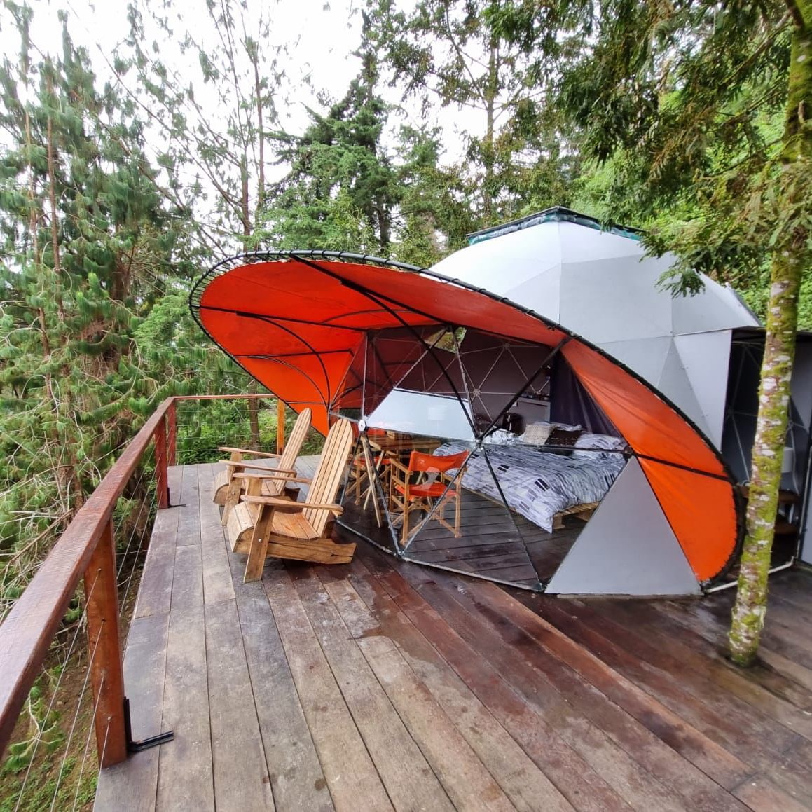 Ubicado en una espectacular plataforma aérea, con una increíble vista panorámica se encuentra el Domo/Glamping Lulú. Su cama King con plumón asegura noches de ensueño, y su estructura ofrece calidez en las noches frías de la montaña. Este Domo/Glamping es ideal para crear recuerdos inolvidables. Cuenta con mesa de comedor, ducha de agua caliente, y una cocina completamente equipada. Estar en su balcón es desconexión total… el mejor espacio para leer y conversar.