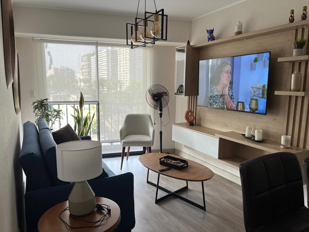 Moderno y acogedor departamento de una habitación, ubicado en zona estratégica de Barranco, límite con Miraflores, frente al MAC y a 5 min de Larcomar. Situado en el piso 9 con vista interna, cerca de museos, parques, bares y restaurantes. Ideal para parejas, viajes de trabajo o familias pequeñas. Equipado con TV en sala y dormitorio. Opcional: cochera y cuna corral. No está permitido fumar dentro del alojamiento.
