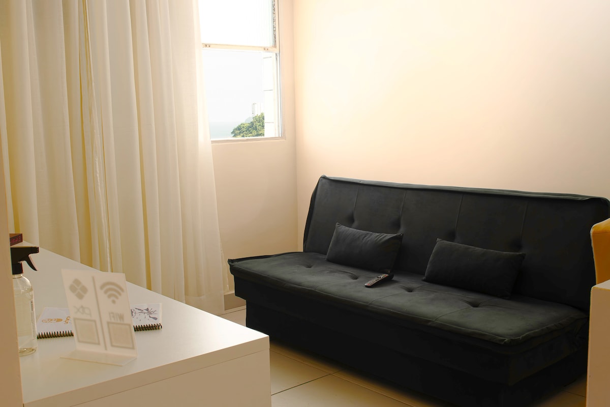 Apartamento Studio con vista a la piscina en el ilimitado frente al mar en Santos. Para que sea más fácil para los huéspedes hacer el check-in y el check-out, tenemos una puerta con un sistema de apertura de tarjetas, para que el huésped no dependa de nadie para acceder al apartamento. El departamento tiene una cama tamaño queen, armario, cortinas opacas, sofá de 2 plazas (con cama doble), TV inteligente de 49", wifi (500 mb), iluminación LED moderna, aire acondicionado dividido y una red de seguridad en el balcón. 1 plaza de aparcamiento