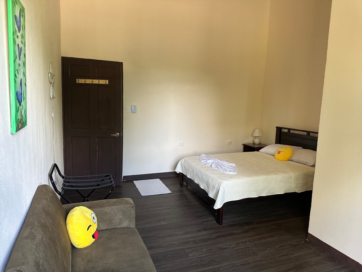 Nuestro studio apartamento es ideal para parejas que buscan tranquilidad y conexión con la naturaleza, en un espacio moderno y elegante y esta en un segundo piso. Podrán disfrutar del sonido del río, observar tucanes y aves al atardecer mientras disfruta la vista desde la terraza. Contamos con senderos en el bosque y dos accesos al río, perfectos para bañarse y disfrutar del agua fresca de Costa Rica. El studio incluye una cama nido que permite alojar hasta 3 personas o bien una pareja y un niño