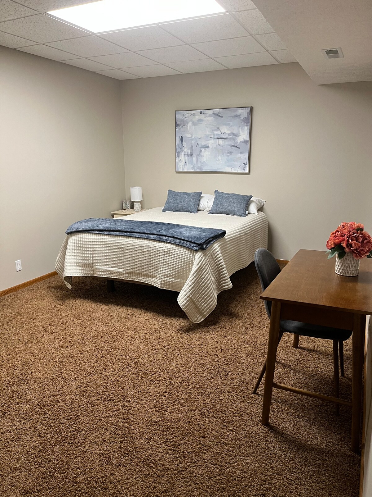 Keep it safe and simple at this peaceful and centrally-located private suite in Omaha’s premier suburb, Papillion. Features a Tempur-pedic breeze mattress with an adjustable base, 55 inch flatscreen TV with streaming services, high speed, Internet, stocked kitchenette with coffee, work desk, and private keyless entry. A quick drive to Office Air Force Base, Bellevue, downtown Omaha and interstate access. Centrally located close to shopping, restaurants, gym, bars, gas etc.