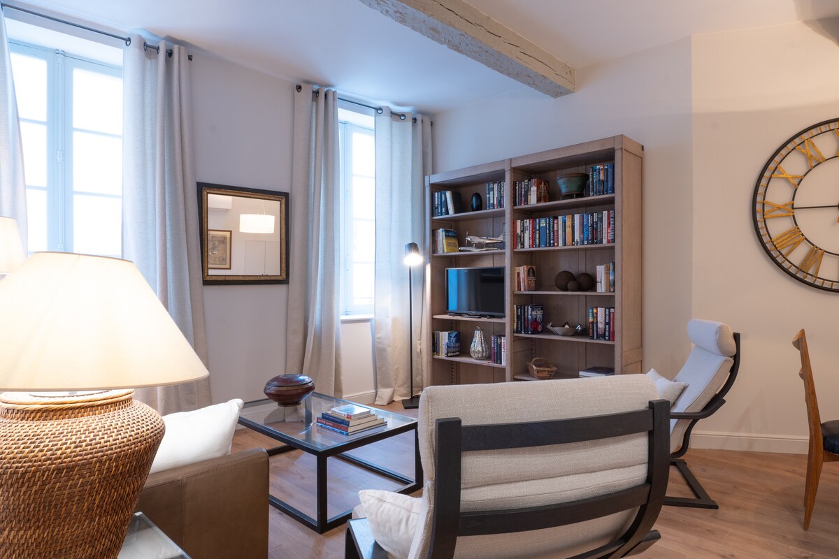 Apartamento con carácter Intra-Muros. Te encantará este pequeño apartamento en una mansión del siglo XVIII. Con techos altos y grandes ventanales, cuenta con un dormitorio separado, salón/cocina y baño. Con aire acondicionado para las noches cálidas. Bonus: la pequeña terraza con árboles da a una calle peatonal con restaurantes, que es muy animada en verano. Ideal para estancias cortas y medianas.