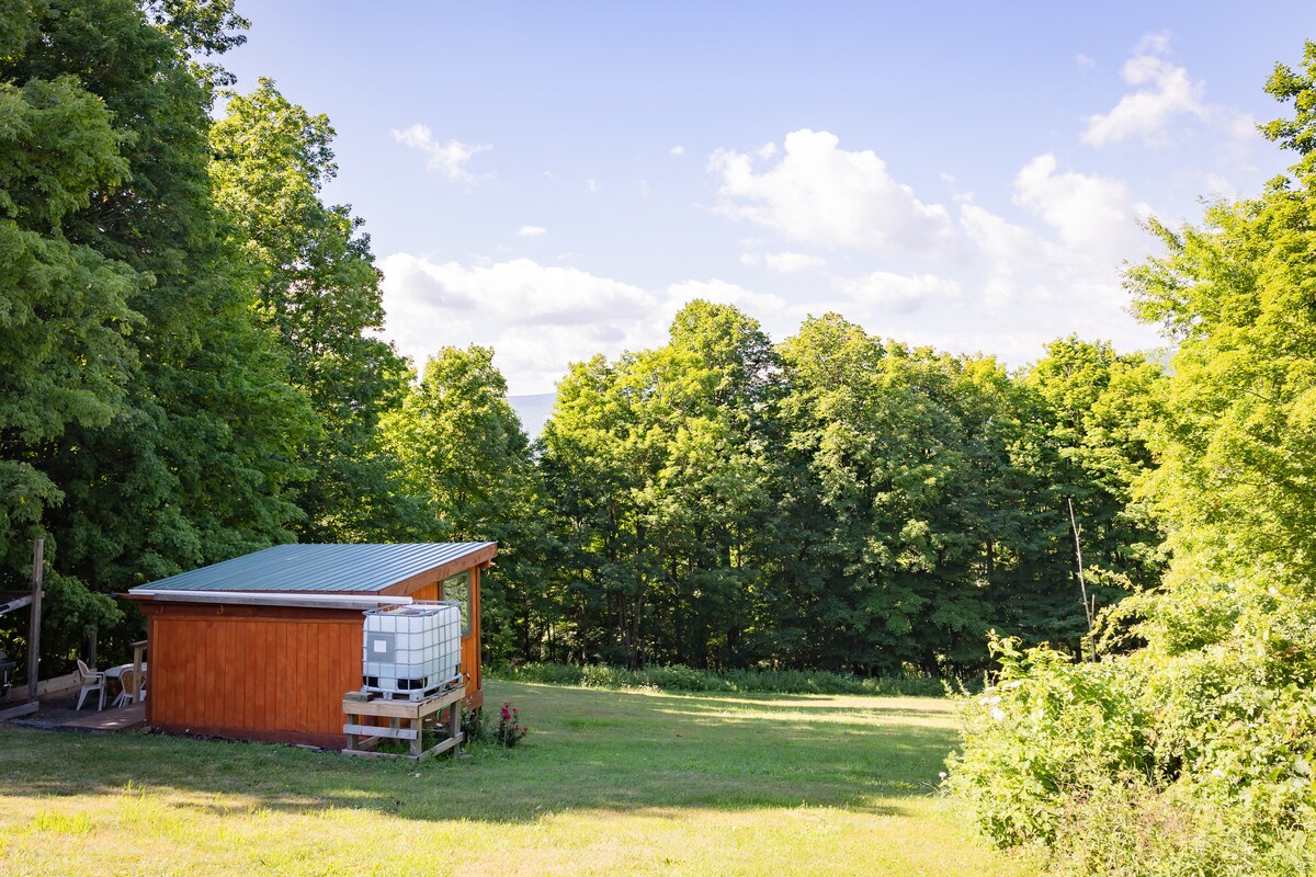 Disfruta del glamping a 1700 pies sobre el nivel del mar en esta minicasa fuera de la red con vistas panorámicas de las montañas Catskill a solo 2,5 horas de Nueva York. Ideal para parejas. Es una de las 4 estructuras únicas en la propiedad. Esta acogedora cabaña bien aislada tiene un colchón híbrido de espuma viscoelástica/colchón tamaño queen con ropa de cama completa y bañera de enfriamiento interior, parrilla Weber, asientos al aire libre y sillones. Pubs, restaurantes y Pizza Cafe a menos de 15 minutos de la propiedad situada a lo largo del arroyo Catskill.