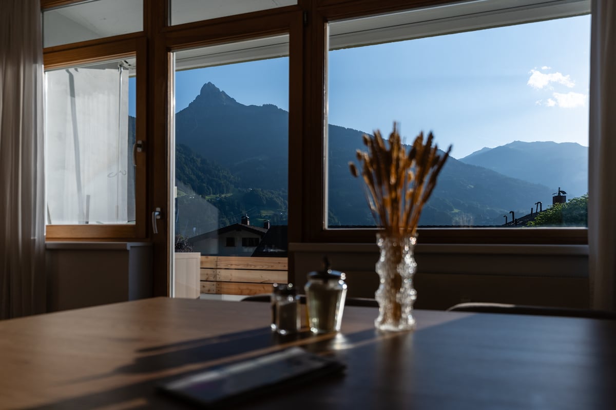 A través de los grandes ventanales panorámicos, podréis dejar que el sol os acaricie al despertar y contemplar la luz de la luna por la noche mientras tomáis una copa de vino. ¡Disfrutar del impresionante panorama montañoso desde cada habitación es algo que solo podéis conseguir con nosotros! El apartamento de vacaciones "todo incluido" para 2 a 6 personas está integrado en nuestra moderna construcción de madera. ¡Estamos deseando recibir a nuevos huéspedes y viejos amigos y estamos a disposición de todos los huéspedes para ayudarles con la planificación y realización de excursiones!