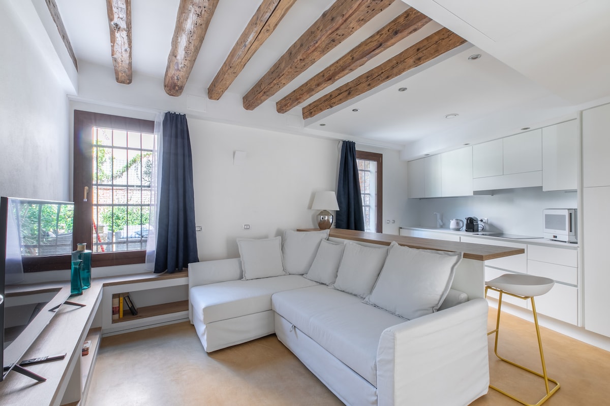 Top notch renotation of historic apartment in strategic location near the station. Right on the canal!A unique feature is the antique private water door (house also has its main private entrance on the street). On the other side it faces a beautiful Venetian courtyard. Living room with kitchen area, dining area, two bedrooms, bathroom. Attention to detail, designer furnishings... a quintessential Venetian home reinvented with a modern touch. The house is equpped with keypad for SELF CHECK-IN