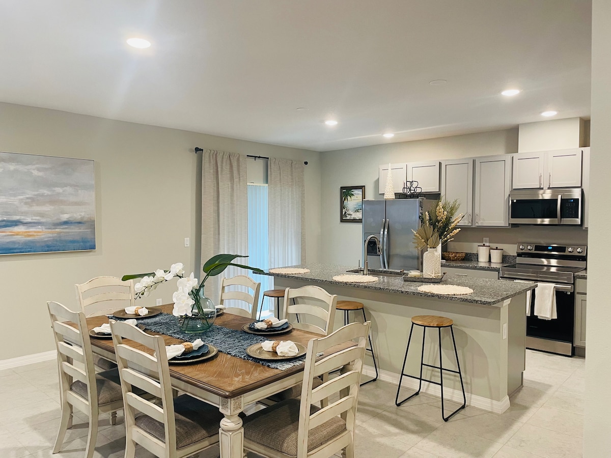 Relájate con toda la familia en este tranquilo lugar para quedarse. 15 minutos a la playa, 5 minutos a la orilla del río. A una hora de Disney y del aeropuerto de Orlando. Hermoso y único. Dos dormitorios grandes y dos baños. Una habitación cerrada de Florida con aire acondicionado y una cama de día. Puede dormir cómodamente 5. Cocina con encimeras de cuarzo y electrodomésticos de grado profesional. 4 taburetes de bar alrededor de la isla de la encimera. Comedor abierto con capacidad para 4 personas. Garaje de dos puestos con lavadora y secadora.