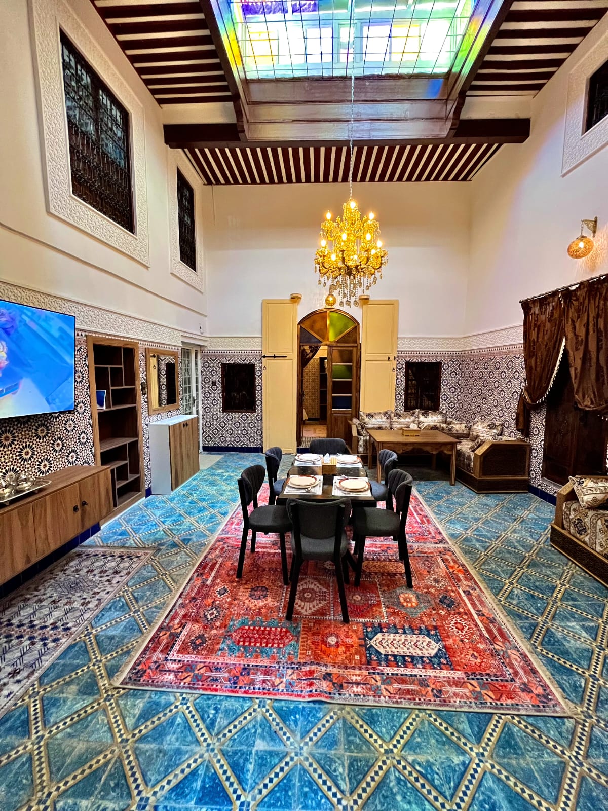 Mezcla con maestría el estilo marroquí atemporal con un diseño moderno Situado en el corazón de la antigua Medina Fez. Ofrece una experiencia inigualable. La amplia suite cuenta con un gran dormitorio, sala de estar adornada con baño privado de mosaico marroquí y aire acondicionado. Los muebles recogidos a mano y las telas exquisitas crean un ambiente de elegancia. Comienza el día con un delicioso desayuno en tu terraza privada y disfruta de la máxima paz y privacidad. ¡Experimenta la magia de Marruecos como nunca antes!