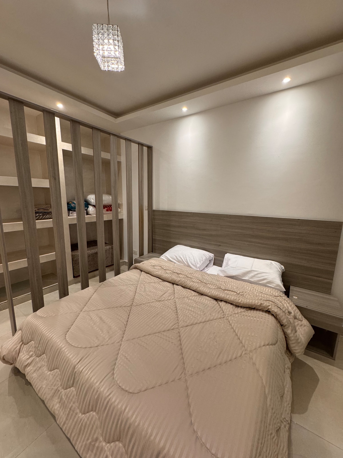 ¡Te damos la bienvenida a tu escapada perfecta! Disfruta de la comodidad en nuestro apartamento de dos dormitorios recién amueblado, con una cocina totalmente equipada y una amplia sala de estar con TV inteligente de 55 pulgadas. ¡Mantente conectado con internet de alta velocidad! Situado en el corazón de Nuevo Cairo, a pocos pasos de Waterway Boulevard y de las atracciones cercanas. ¡Reserva ahora para una estancia inolvidable en nuestros elegantes apartamentos con servicios!