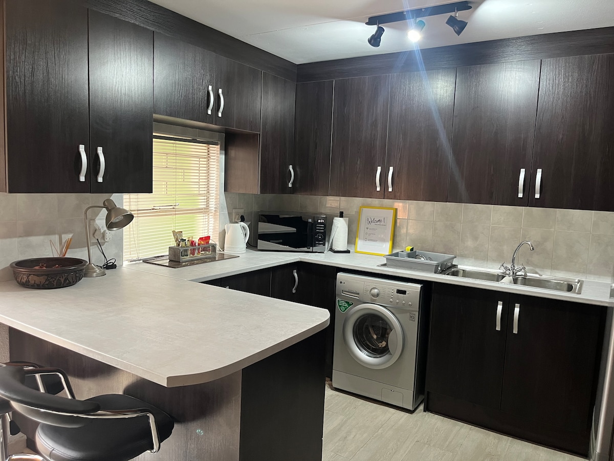 Encantador apartamento de 1 dormitorio con entrada privada, perfecto para parejas y amantes de las mascotas. Diseño abierto, cocina totalmente equipada con estufa de gas y horno ecléctico. Patio privado, no fumadores, cómoda cama tamaño queen, sistema de alarma y servicio de limpieza. Incluye lavadora, sin energía de respaldo. Vales de comida disponibles para el restaurante Eish, a 5 minutos en coche. Secunda Mall (3 min) y Sasol Main Gate (7 min), ideal tanto para estancias de ocio como corporativas. Disfruta de una mezcla de comodidad, conveniencia y seguridad en un entorno sereno.