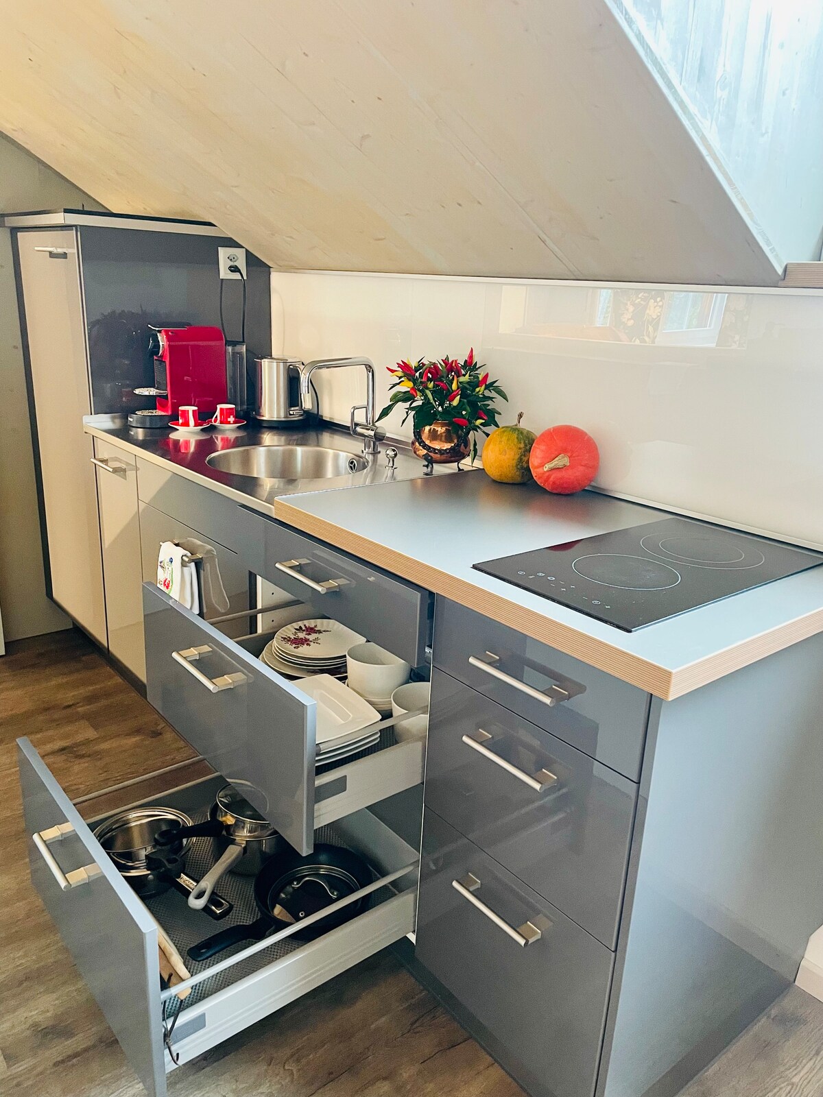 Siéntate y relájate en este alojamiento tranquilo y elegante con una superficie habitable de unos 125 m² en medio de la naturaleza. Tu escapada exclusiva con vistas panorámicas de 360 grados al lago de Säntis/Bodensee y, sin embargo, tan cerca de atracciones como St.Gallen/Appenzell. Esta casa de estilo Appenzell de 200 años de antigüedad se alza sobre Herisau AR y sus propietarios la llaman cariñosamente «GöttiFritz». Brilla con autenticidad en un hermoso paisaje de montañas y colinas: un verdadero refugio para el alma.