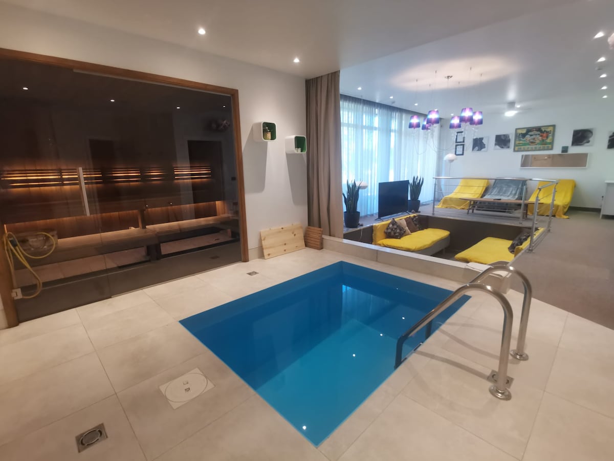 Zona de SPA con SAUNA, PISCINA y DOS CAMAS DOBLES. Un gran lugar para relajarse y procedimientos de bienestar ADECUADO PARA 6 VISITANTES DURANTE LA VISITA DIURNA O PARA 4 PERSONAS con LA capacidad DE PERNOCTAR. El sauna (2-3 horas caliente) está incluido en el precio, si deseas obtener horas adicionales o utilizar el sauna en el segundo día de tu estancia, costará 30EUR por 3 horas (o 10EUR/1 hora si necesitas más de tres horas). Informa al administrador sobre tu deseo con anticipación (con dos horas de anticipación o antes).
