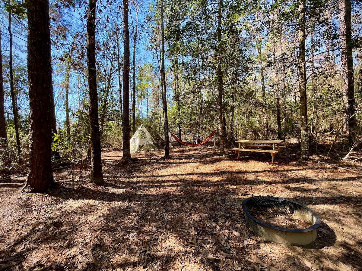 Escápate a un acogedor retiro glamping en Lutz, FL, ubicado en los árboles con todas las comodidades de un hogar. Disfruta de una cama tamaño queen, baño privado, jacuzzi, estanque de pesca, TV, wifi y comedor al aire libre. El retiro también cuenta con parrilla, chimenea, Keurig, aire acondicionado, calefacción y ventilador. ¡Se admiten mascotas! Aunque está cerca de una calle concurrida, una barrera de sonido de 10 pies garantiza la paz. Cerca de restaurantes y entretenimiento, es la combinación perfecta de naturaleza y comodidad. Este retiro ofrece lo mejor de ambos mundos: aislamiento y comodidad.