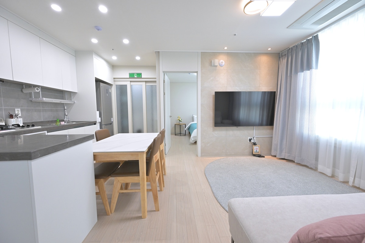 Terminal compleja a 5 minutos Alojamiento emocional Estancia acogedora Consta de 2 habitaciones/1 baño/cocina/sala de estar Se puede utilizar la ropa de cama del hotel para dormir cómodamente. - A 5 minutos a pie de la terminal del complejo/a 9 minutos en auto de la estación de Daejeon - La ropa de cama se cambia todos los días. - Se instala un purificador de agua de última generación. - Champú, acondicionador, gel de baño, toallas, cepillo de dientes, pasta de dientes, limpieza de espuma, secador de pelo de lujo, alisador de pelo, etc. están preparados en el baño. - La cocina está equipada con nevera, microondas, cafetera, café, agua, tabla de cortar, vajilla, copas de vino, etc. - Sala de estar (TV por Internet), dormitorio (haz nuevo/Netflix gratuito disponible) - Estacionamiento gratuito disponible frente al alojamiento. - Habitación 1: cama baja tamaño queen, 1 mesa lateral, 1 secadora. - Habitación 2: cama baja tamaño queen, 1 mesa lateral. - Es un edificio nuevo con ascensor. [Precauciones] Llegada: 4:00 p. m. Salida: 12:00 (Si cambias la hora de llegada/salida, avísanos con anticipación) Está prohibido fumar en el alojamiento.