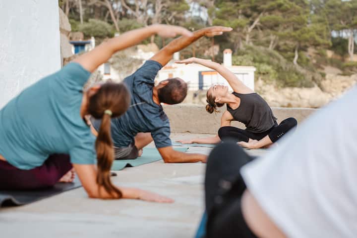 Sesión de vinyasa yoga @laura.travelyoga con vistas al mar en Palamós - Costa Brava, adaptada a diferentes niveles. Contacta para organizar eventos y retiros privados (yoga en casa o en hoteles, un finde para desconectar, despedidas de soltera).