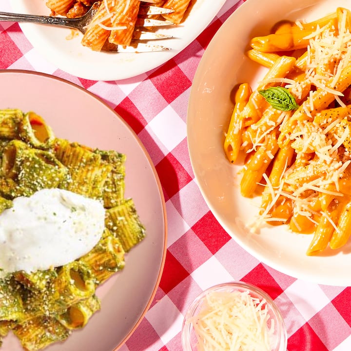 Disfruta de la comida casera italiana con los rigatoni al horno con tomate y ricotta batida del chef Marc Forgione (rigatoni mezzi al dente, salsa de tomate Pomodoro, cucharadas de ricotta batida, pesto de albahaca, pan rallado Panko tostado), o los penne con salsa rosa picante del chef John DeLucie (salsa marinara roja y salsa alfredo blanca mezcladas para crear una salsa rosa cremosa y picante, pimiento rojo triturado, queso Grana Padano, albahaca fresca). Incluye 2 de cada comida.