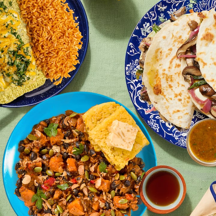 Reimagina tus platos latinos favoritos con sabrosas verduras en la quesadilla de champiñones caramelizados del chef Akhtar Nawab (champiñones cremini y ostra, queso cheddar y Oaxaca, cebollas rojas encurtidas, crema mexicana y salsa chipotle), las enchiladas suizas de espinacas y queso de la chef Ivy Stark (salsa verde, arroz rojo mexicano) y el chile de calabaza y frijoles negros del chef José Garcés (soya rica en proteínas, pan de maíz poblano, mantequilla de miel de maple y pepitas). Incluye 1 de cada comida.