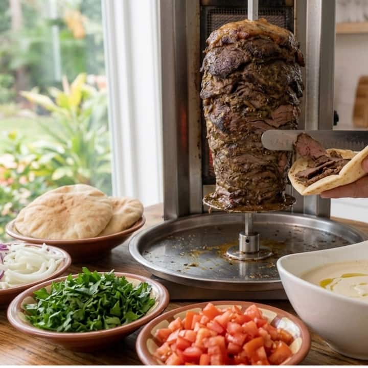 Asador de shawarma de carne de res en vivo