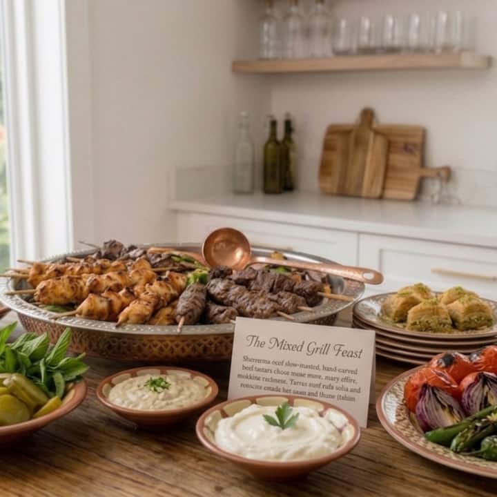 ¡Un festín libanés de primera calidad! Asamos a la parrilla, en vivo, una variedad de carnes tradicionales sobre fuego abierto con adobos auténticos.