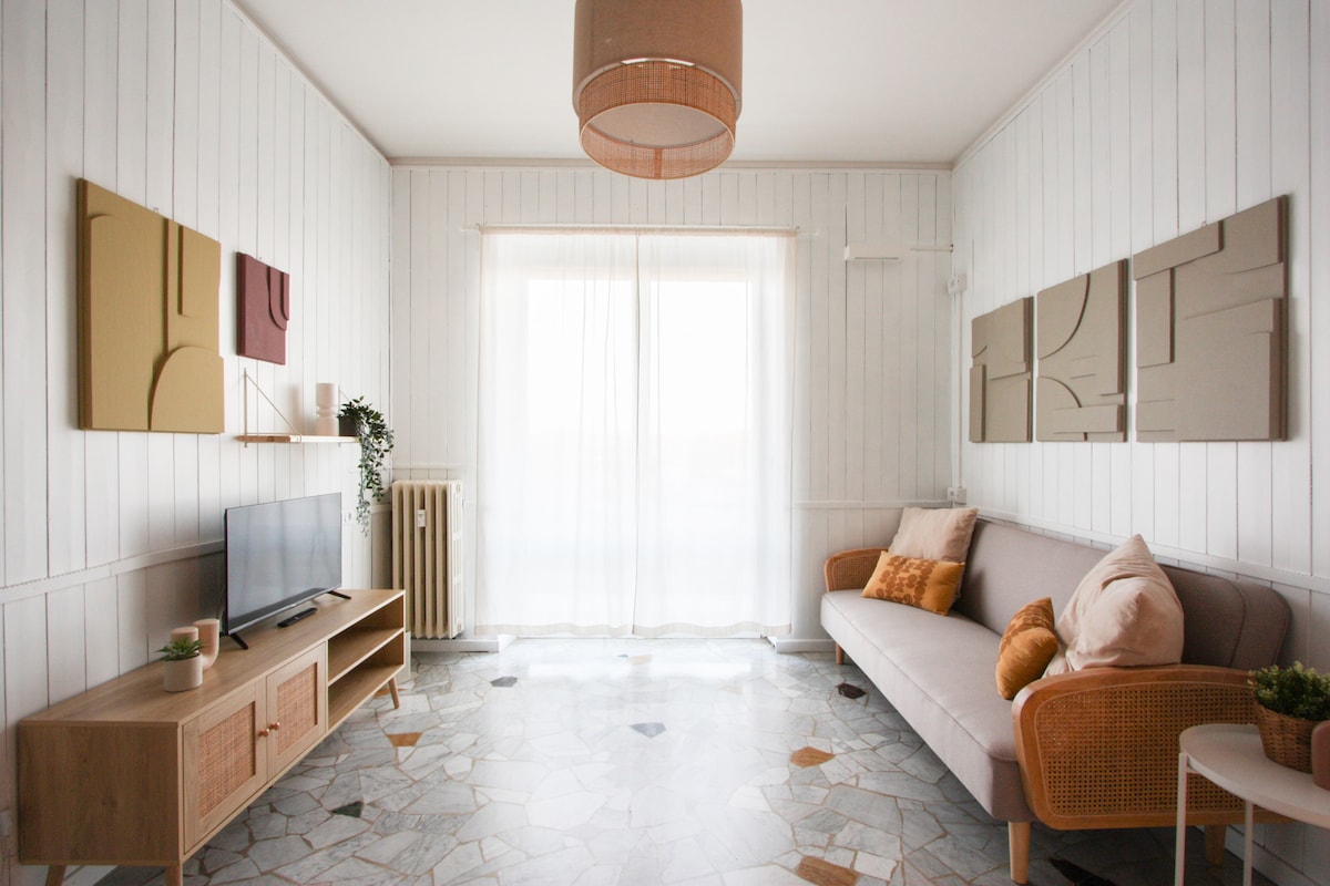 Me encanta este gran apartamento de dos habitaciones de 69 metros cuadrados. Me llamó la atención su luminosidad, las puestas de sol al oeste con vistas a la ciudad y el espacioso «openspace» con península para cocinar. Perfecto para quienes buscan un lugar donde sentirse en paz con todas las comodidades, pero sin alejarse del centro. Decorado con un estilo minimalista y elegante. A solo 5 minutos a pie de la parada de metro M1 Sesto Rondò, en 20 minutos en metro se llega a la catedral de Milán. Debajo de la casa hay una panadería, un restaurante y tiendas.