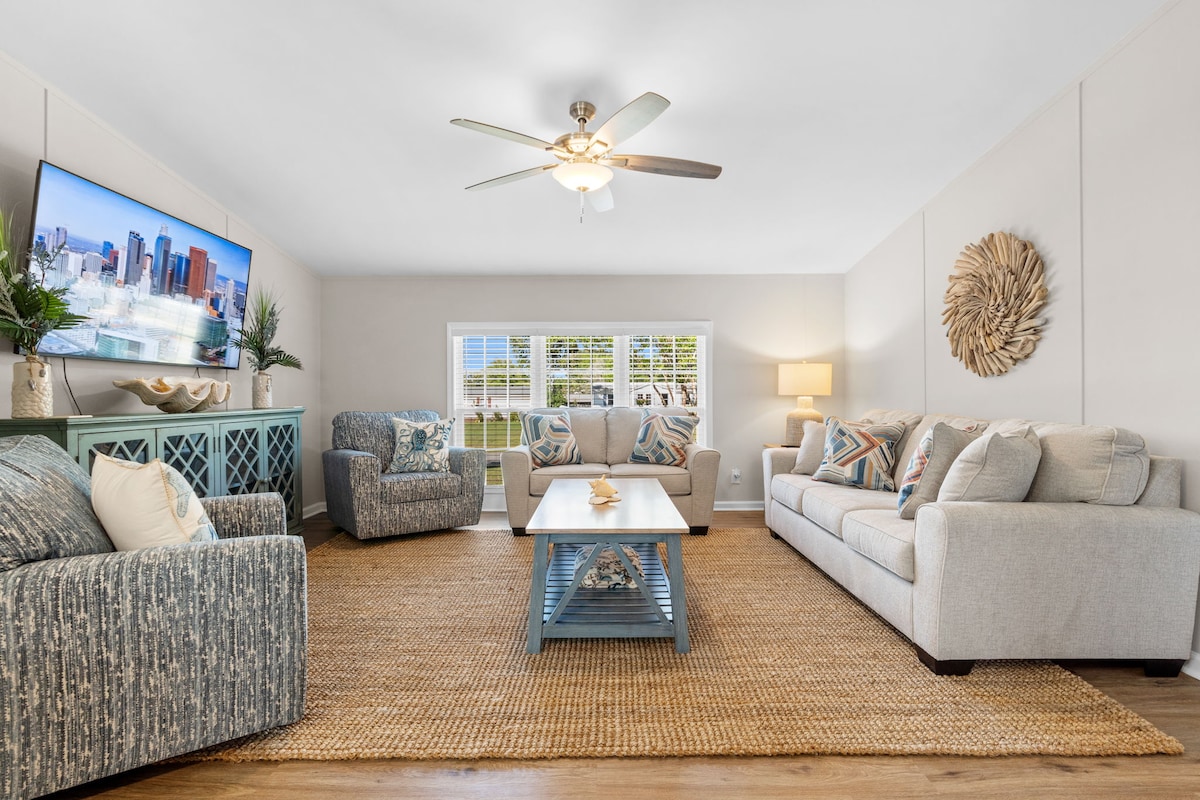 ¡Esta casa de un solo nivel, céntrica y apta para perros, te hará crear días perfectos en muy poco tiempo! Remodelación reciente en 2022. ¡A menos de 2 millas de la playa, a minutos de restaurantes y varios campos de golf al alcance! En el interior encontrarás pisos de madera, una sala de estar/cocina abierta con mucho espacio para reunirse y una encantadora habitación adyacente que incluye una mesa con capacidad para seis personas. ¡Televisores en todas las habitaciones con streaming y colchones Serta para garantizar un sueño reparador!