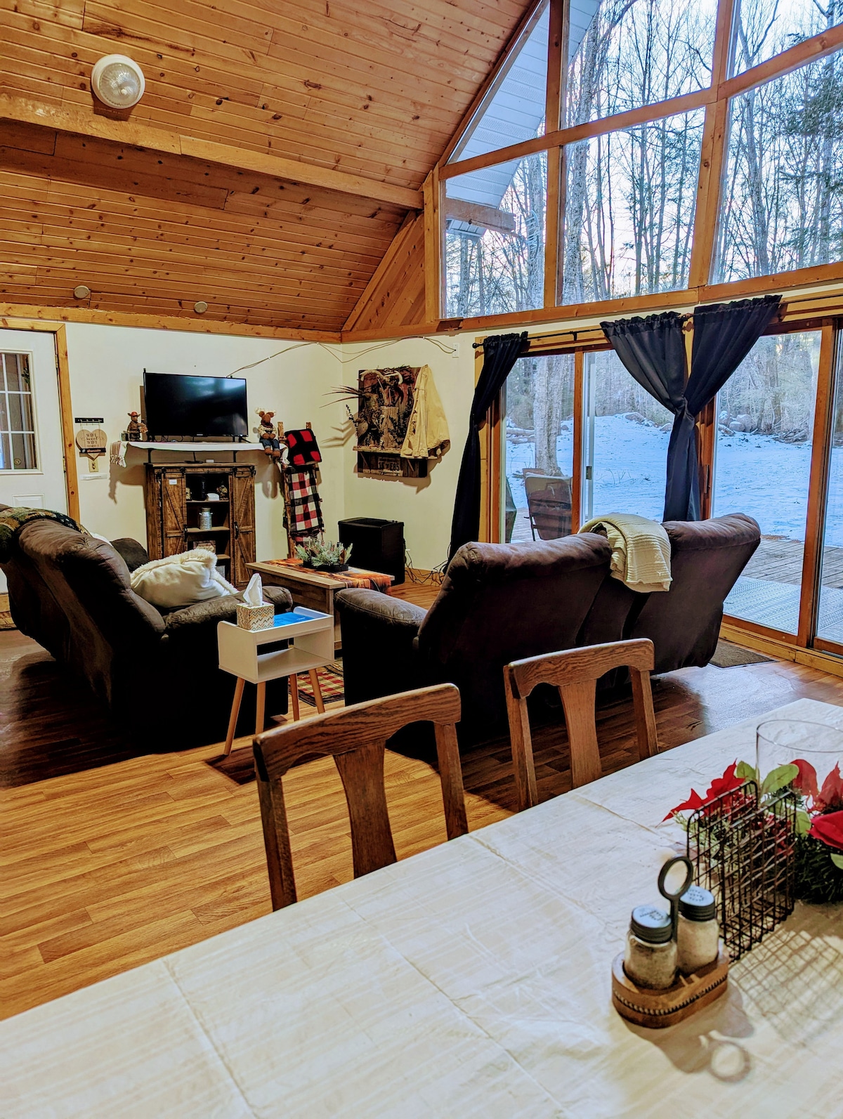 Nuestra cabaña está aislada en el campo cerca de un río, sin otras casas cercanas, solo vida silvestre y paz y tranquilidad. Un porche delantero para relajarse y una terraza más nueva en la parte trasera para cocinar o observar la vida silvestre. El interior acaba de ser completamente actualizado, con algunos toques antiguos originales. Arriba hay 3 dormitorios y medio de baño, abajo un dormitorio principal con baño, baño, sala de estar abierta, área de cocina de la sala de estar. Y área de lavandería del nivel principal. Listo para unas vacaciones largas o una escapada rápida.