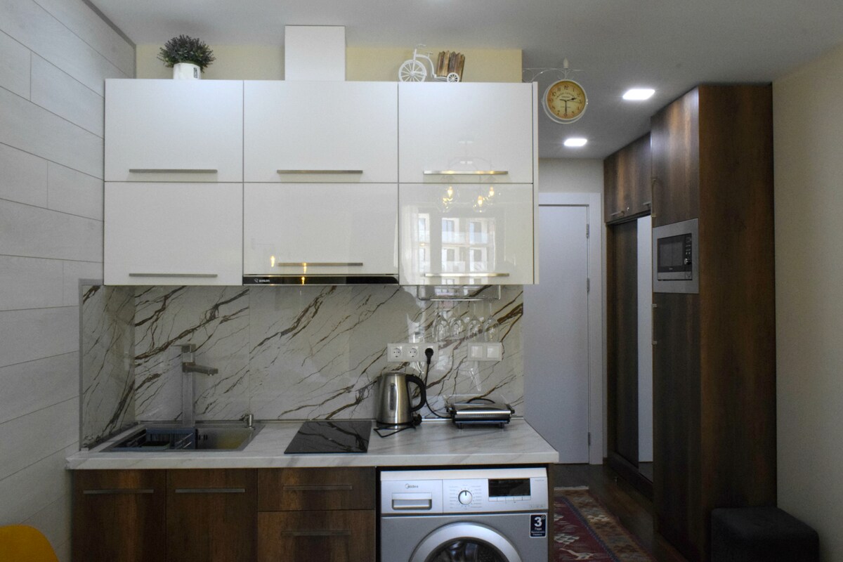 Estudio de un dormitorio con balcón con bonitas vistas a la montaña (capacidad para 2 personas). Equipado en estilo LOFT, hay todo lo que ayudará a que tu estancia sea cómoda y conveniente: nevera, microondas, estufa eléctrica, estufa eléctrica, platos, ropa de cama, armario grande, armario grande para cosas, cómodo sofá cama plegable con un maravilloso colchón, lavadora, secador de pelo. La ubicación es genial, a 3 minutos a pie del elevador principal.