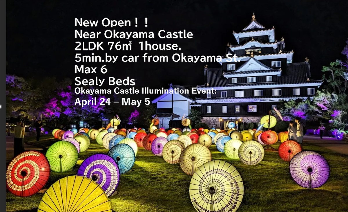 Una ubicación especial con vistas al Castillo de Okayama y a Korakuen, uno de los tres jardines más famosos de Japón, a pocos pasos.Con vistas que cambian con las estaciones, puedes disfrutar de un momento de lujo y relajación a lo largo del paseo ribereño, que ofrece acceso directo a la orilla del río y vistas al Castillo de Okayama.La zona cuenta con sofisticadas cafeterías y restaurantes, museos de arte y prácticos servicios, lo que hace que tu estancia sea una experiencia verdaderamente enriquecedora. Solo se tarda 3 minutos en llegar desde la estación de Shiroshita más cercana hasta la estación de Okayama.La ubicación es ideal como base para viajar, no solo para hacer viajes por carretera, sino también para utilizar el Shinkansen, y se puede llegar fácilmente a Kurashiki, Naoshima y las islas Setouchi en tren. Esta espaciosa casa unifamiliar de 77 m² con 2 dormitorios y 2 baños está ubicada en un entorno realmente privilegiado.Los muebles y electrodomésticos recién instalados, junto con los sofisticados interiores, crean una experiencia de alta calidad que te aleja de la vida cotidiana.Amplio dormitorio con una lujosa cama Sealy y una sala de estar y comedor de concepto abierto de 18 tatamis (59,3 ft² / 5,5 m²) con cocina completa y una cómoda zona de sofá.Esperamos ofrecerte una estancia relajante y satisfactoria que alivie suavemente el cansancio de tus viajes.