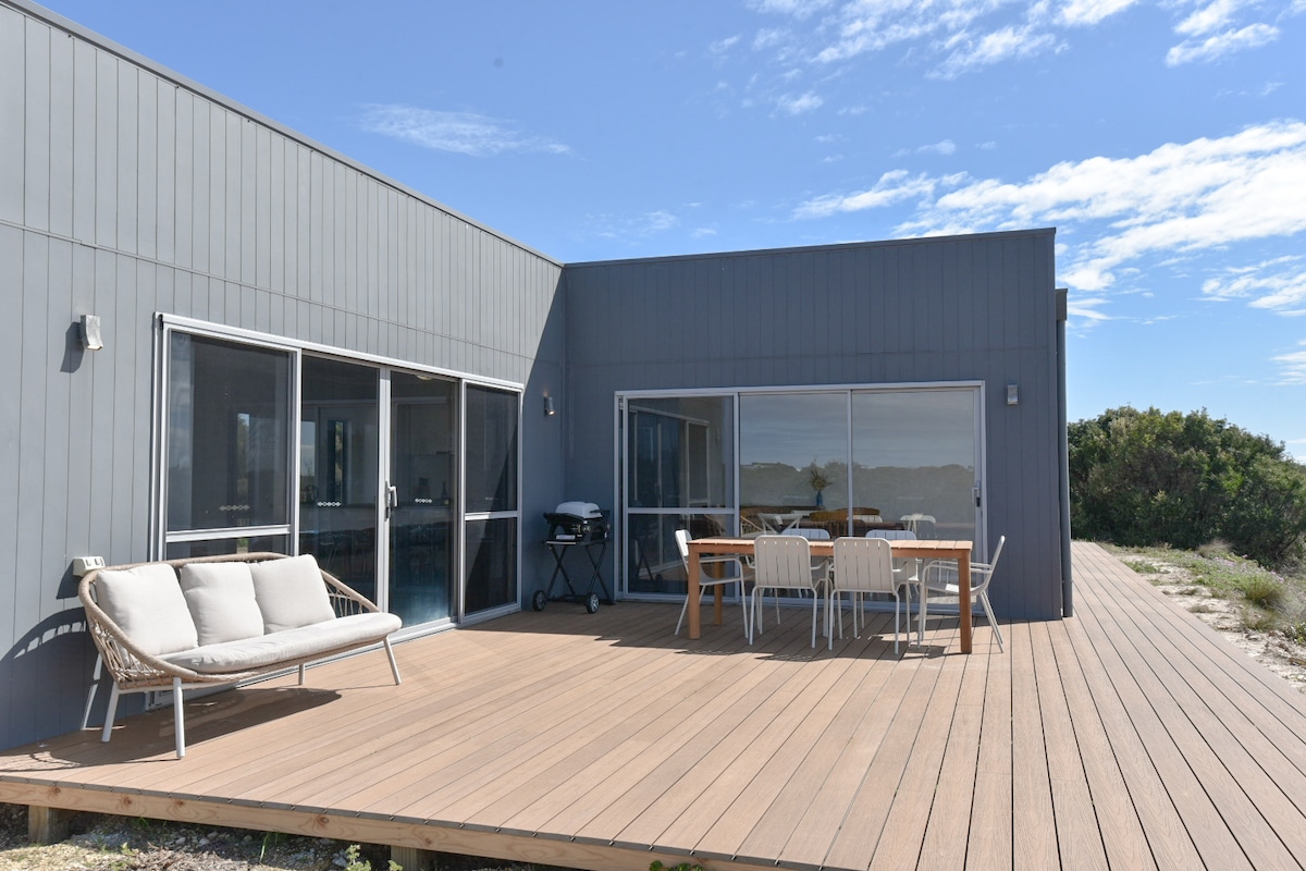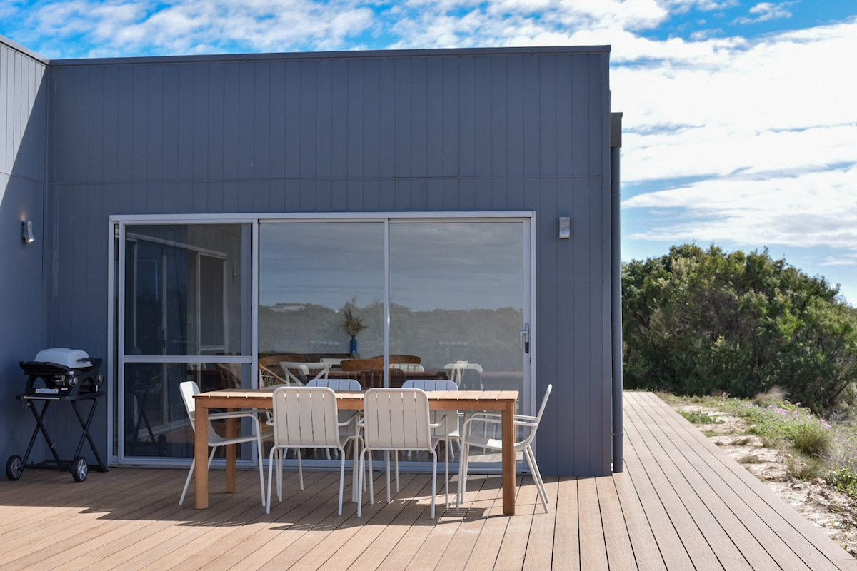 Our one-bedroom home is on a 5-acre property with stunning ocean views from the kitchen and living area. The separate bathroom pod, conveniently situated just across the deck, features a shower with panoramic ocean views and window looking out to the peaceful bush. A relaxing home for couples visiting Bremer Bay. Located on Point Henry Peninsula, our location offers easy access to Bremer's beautiful white sandy beaches, Fitzgerald National Park and unique Orca whale watching tours. EV friendly