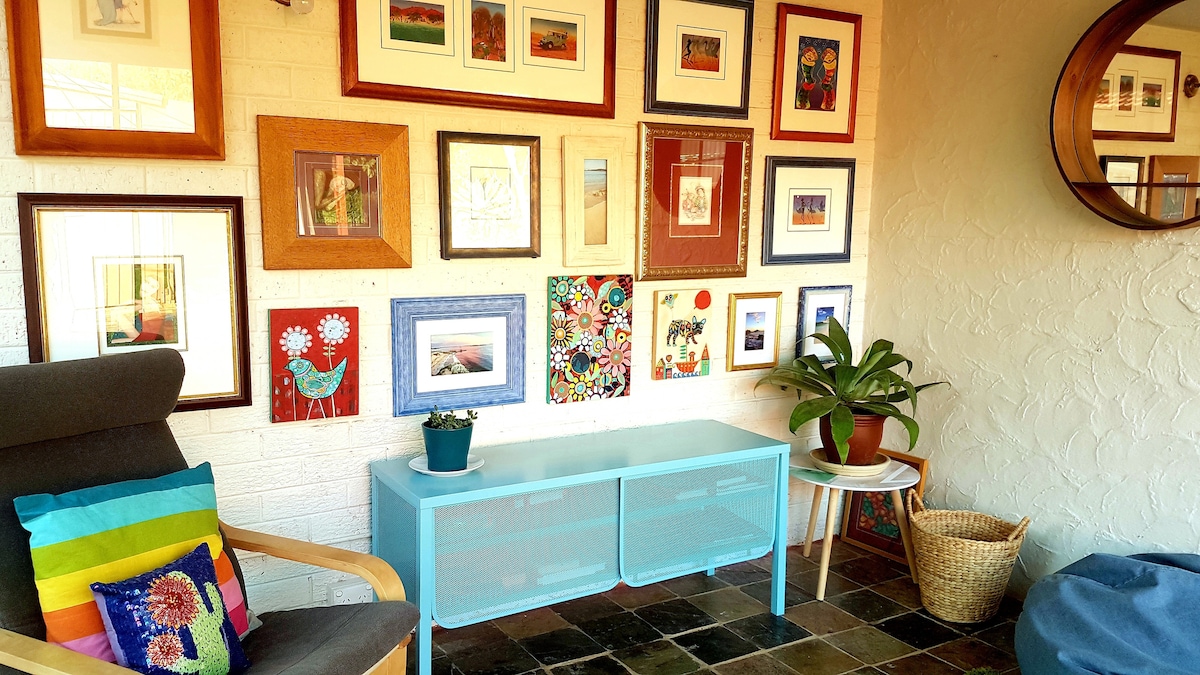 Silver Gypsy Flat adjoins our home. Key entry, secure steel window & door screens, a/c, table, chairs, pantry, induction cooktop, mini-oven, sandwich maker, frypan, kettle, toaster, pod coffee maker, juicer, glass oven, microwave, rice cooker, fridge/freezer, china, cutlery & glasses. Sofa bed, new 50" tv, lamps, queen bed, desk, chaise lounge, walk-in robe & ensuite, pillows, quilts & linen. Private garden, BBQ, patio table, chairs, brolly & free offroad parking. Late arrivals' Key Lock.