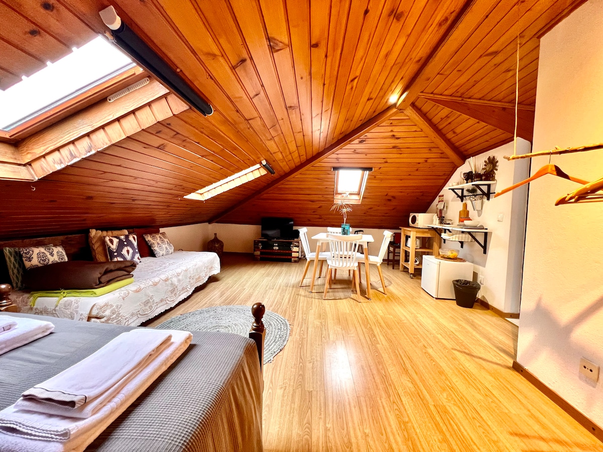 Apartamento loft muy cómodo, totalmente renovado, decoración moderna. Zona sencilla, muy tranquila en el bosque de pinos en contacto con la naturaleza, a 3 km de las playas y a 12 km del centro histórico de Sintra. Cocina con microondas, mininevera, cafetera, baño privado, sofá cama, televisión, wifi.