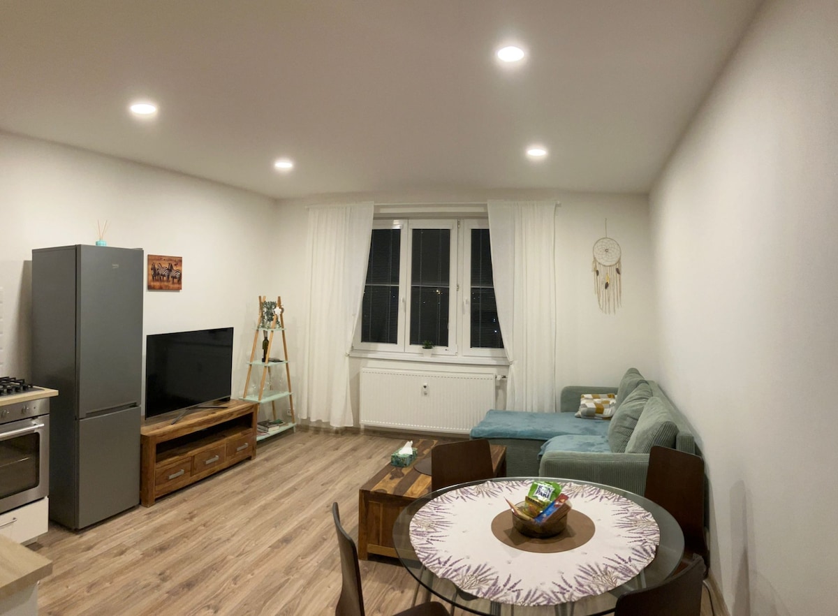 Alquile nuestro apartamento 2+1 recientemente renovado, que ofrece acceso directo a un gran parque verde. Ideal para visitantes que buscan una combinación de ajetreo urbano y tranquilidad natural. Equipado con una cocina moderna, un dormitorio cómodo, una sala de estar con un cómodo sofá cama e Internet de alta velocidad. ¡Hay un balcón con vistas al parque! Excelente ubicación cerca de teatros, museos y tiendas. Ideal para descansar y trabajar. ¡O para hacer yoga en el parque! ¡Reserve para una experiencia inolvidable en Ostrava!