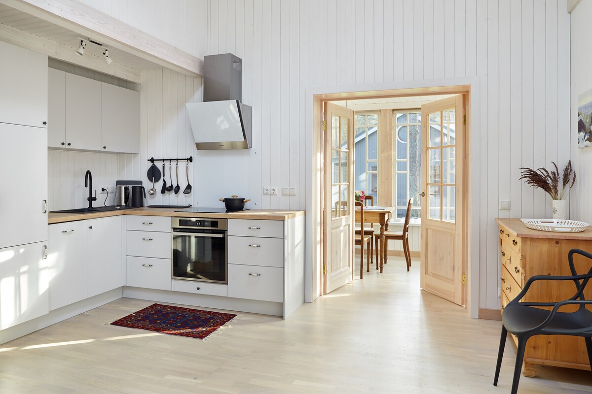 Relájate y desconecta cerca del sereno lago Valgums. Ubicado en el Parque Nacional Kemeri, el espacio es perfecto para los amantes de la naturaleza, ya que ofrece lugares de interés de ardillas juguetonas y diversas especies de aves desde tu puerta. La casa está diseñada para la comodidad, con suelo radiante y una chimenea interior para la comodidad durante todo el año. La cocina totalmente equipada facilita la preparación de comidas y puedes comenzar el día con una taza de café perfecta.