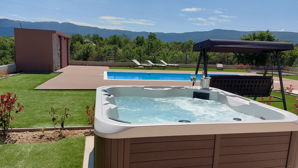 Our brand new luxury villa Luka is located on a wonderful location with beautiful sights and yet still very close to the all local points of interest. The villa is newly built for maximum comfort and luxury with 3 ensuite bedrooms (and an extra room in case of need) and all other amenities you can need. A big private, heated pool with wonderful views, great indoor jacuzzi in spa area with an sauna and gaming/billiard room, a nice fenced outdoor area with a table tennis, badminton or archery set.