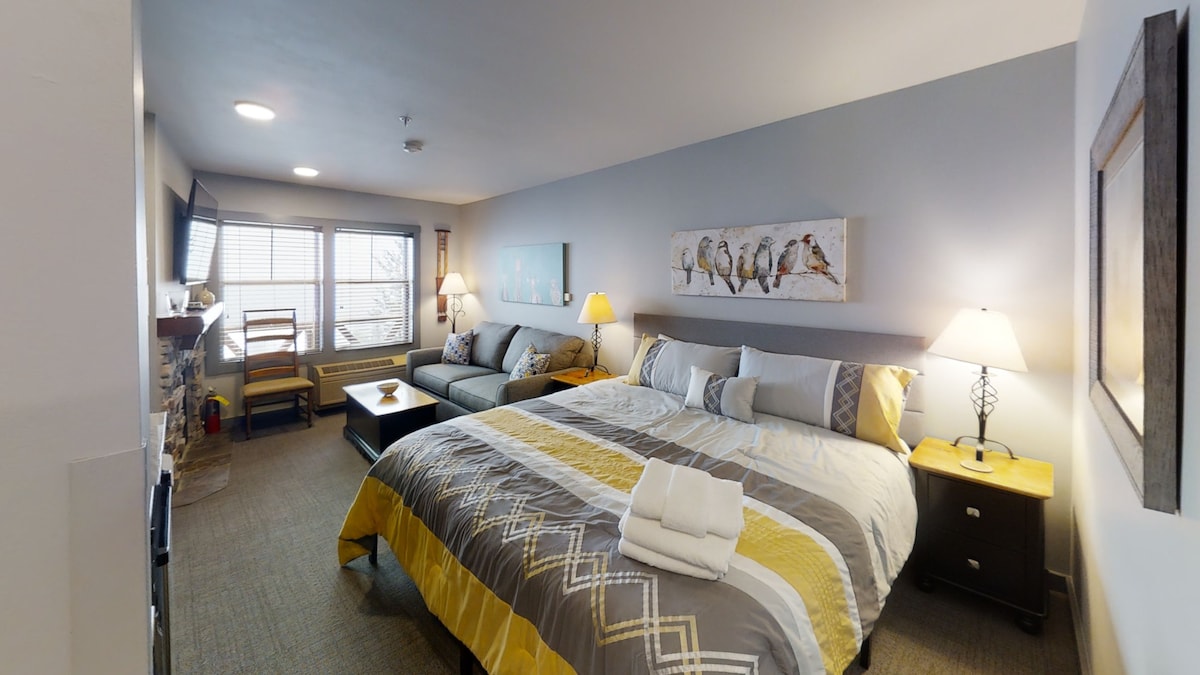 REEMBOLSO COMPLETO SI LA MONTAÑA ESTÁ CERRADA POR TEMPORADA. Acogedor apartamento remodelado de 1 dormitorio y 1 baño, con acceso a pistas de esquí, en el segundo piso del centro del pueblo, con porche privado en el lado del pueblo. Rimfire Lodge está convenientemente ubicado en el corazón de Snowshoe Village. Situado en el pueblo principal con fácil acceso a remontes, restaurantes, tiendas y entretenimiento. Durante tu estancia también tendrás una taquilla privada para esquís, acceso a jacuzzis al aire libre, sauna, gimnasio, sala Alpenglow Hearth y aparcamiento subterráneo climatizado opcional.