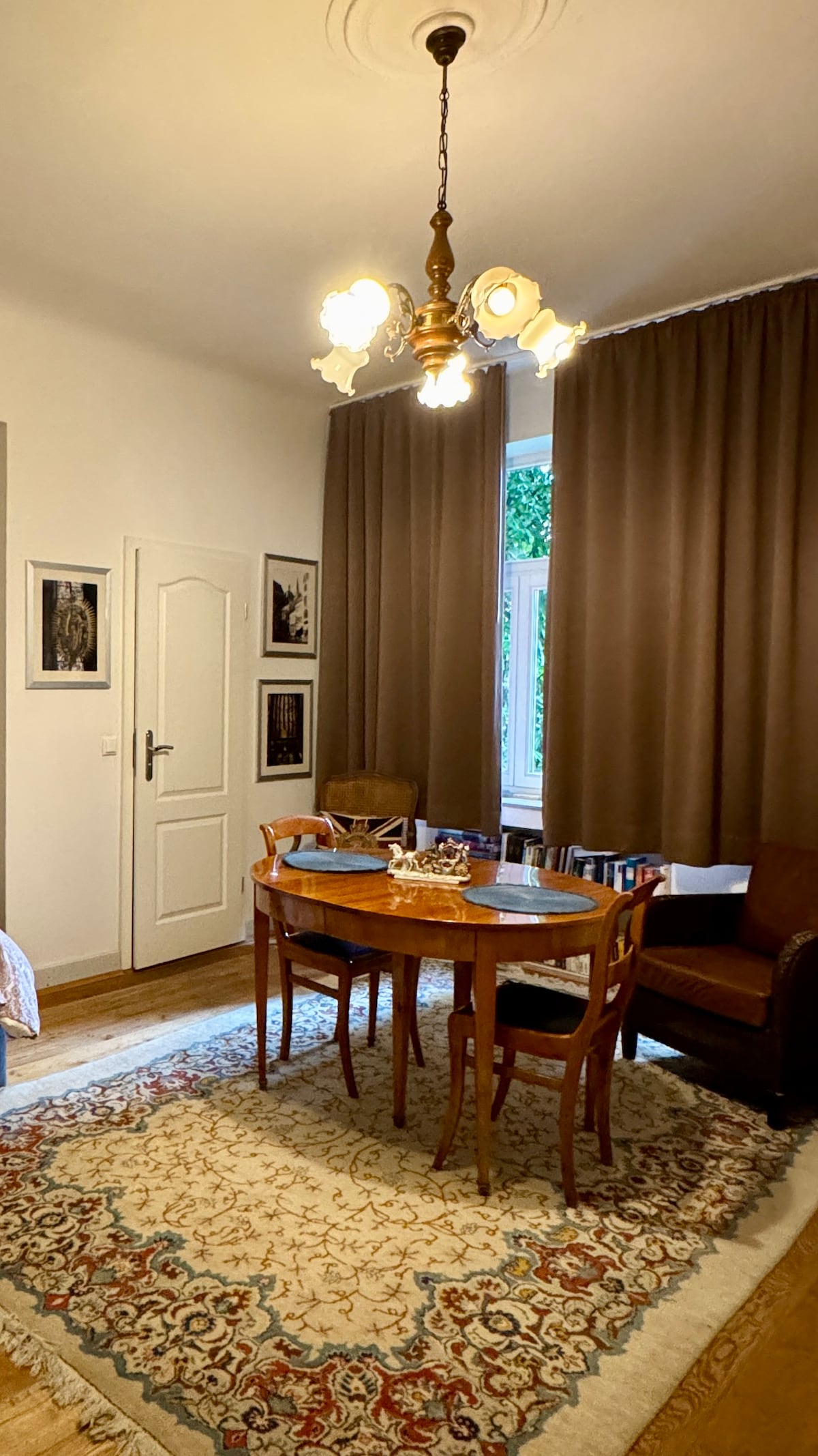 El apartamento, muy tranquilo y decorado con muebles vintage, tiene una sala de estar con comedor, despacho, cocina, dormitorio, vestíbulo, baño y aseo separado y balcón (unos 60 m²). Se encuentra en una calle sin salida muy tranquila frente al auditorio Karman de la Universidad RWTH Aachen, en una ubicación muy céntrica de la ciudad, a 5 minutos a pie de la plaza del mercado, el ayuntamiento y la catedral de Aquisgrán con muchos restaurantes y cafeterías y ofertas culturales.