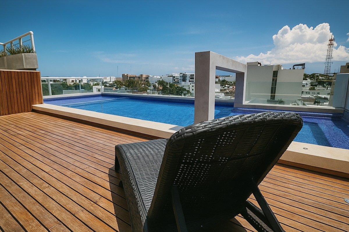 Perfecto para disfrutar de la más agradable estadía en Playa del Carmen! Cerca de las mejores playas, de la 5ta avenida, restaurantes y tiendas, pero lejos del ruido de la noche. El departamento tiene todas las comodidades que puedas necesitar, y esta ubicada en un bello condominio nuevo, un edificio moderno que cuenta con rooftop con piscina y gimnasio y con una ubicación inmejorable!