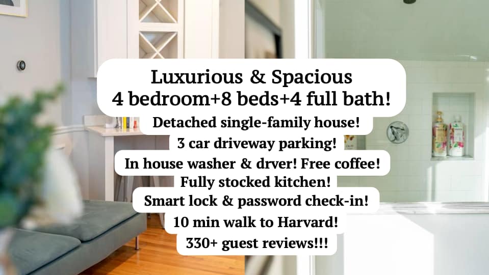 ¡Lujoso y espacioso 4 dormitorios/4 baños completos con 3 plazas de aparcamiento! ¡A 2 minutos a pie de la estación de Porter Square T (línea roja)! ¡A 10 minutos a pie de Harvard! El anuncio incluye 4 dormitorios, 4 baños completos y una pequeña sala de lectura. A 2 minutos a pie del centro comercial Porter Square, Star Market, CVS y Starbucks. ¡Cocina, comedor y lavadora y secadora nuevos! ¡Puedes llamar a este lugar tu hogar!