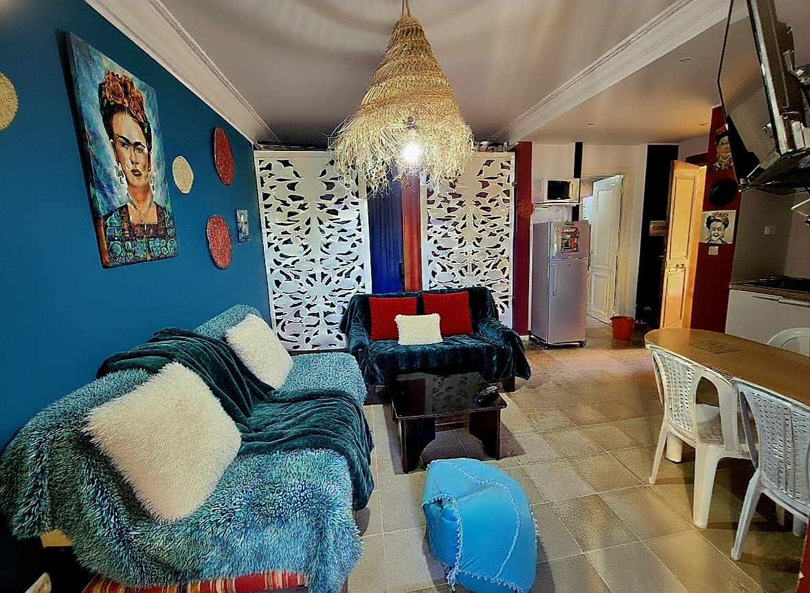Apartamento precioso y totalmente amueblado a 5 minutos a pie de la playa. La ubicación es perfecta, entre la zona turística, la playa y el casco antiguo (Medina). Se puede llegar a todo a pie, incluidos restaurantes, tiendas, supermercados, bares, la playa y el zoco. Barrio seguro para pasear por la noche y salir por la noche. Este apartamento de 80 metros cuadrados tiene 2 dormitorios, sala de estar, cocina, comedor, baño y balcón. Todo el piso, la sala de estar y dos dormitorios tienen aire acondicionado.
