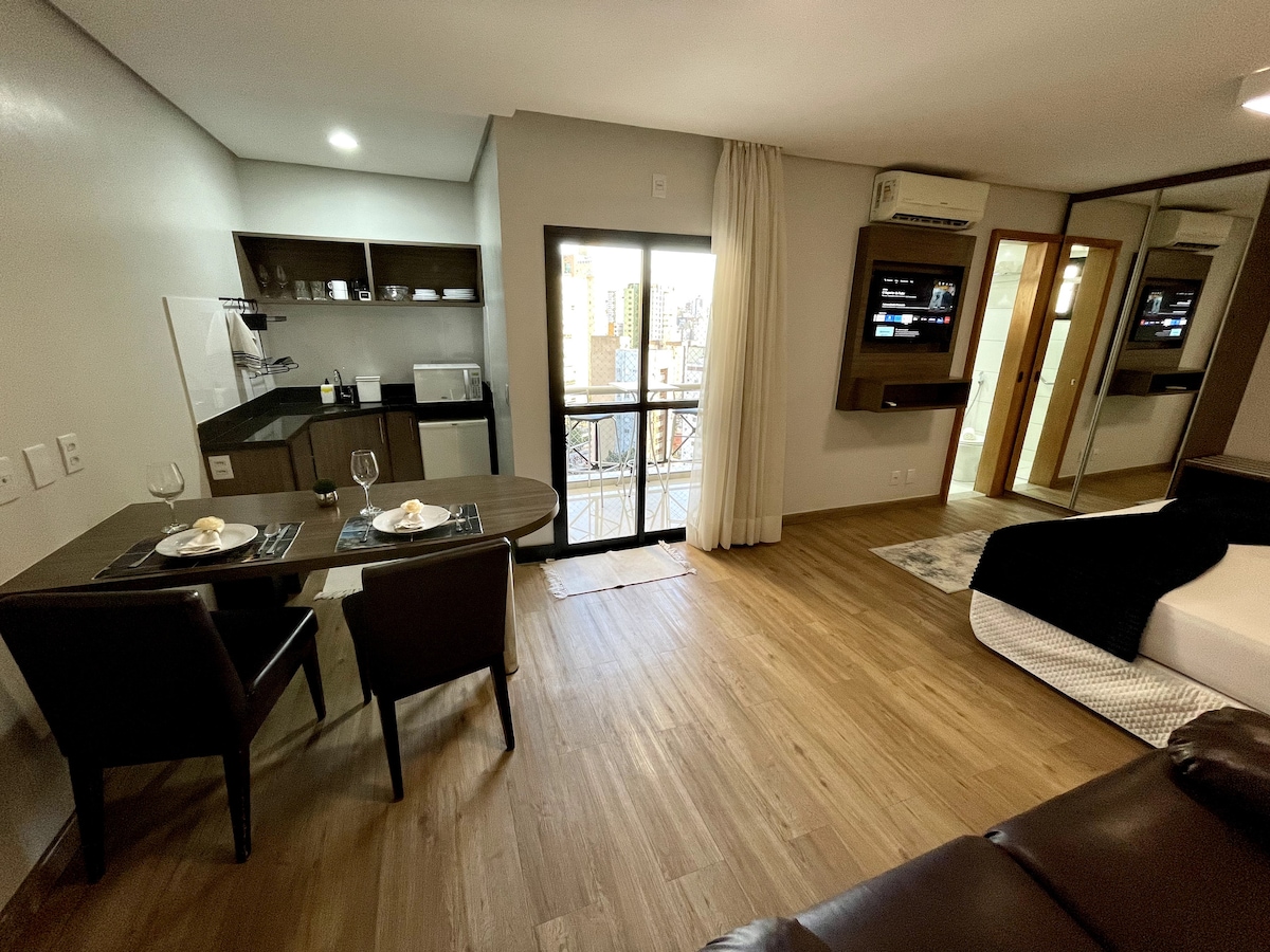 Bem-vindo ao Bali Sanctuary Stay. Um studio boutique inspirado na serenidade de Bali. O ambiente combina móveis assinados, peças autênticas da ilha e elementos naturais, criando um refúgio elegante e acolhedor. Cama queen, Smart TV, internet de alta velocidade e cozinha altamente equipada completam a experiência. Em localização central, é um pequeno santuário urbano para quem busca conforto, design e uma estadia especial, mantendo ao mesmo tempo uma atmosfera tranquila e exclusiva.