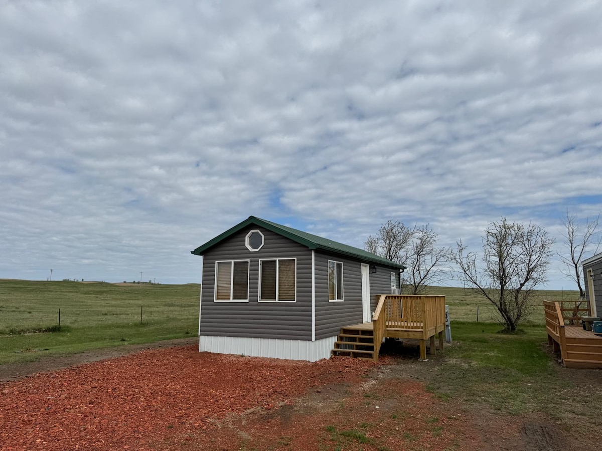 Cabaña totalmente amueblada cuenta con todo lo necesario para una estancia fácil. Disfruta de impresionantes vistas inspiradoras de las tierras baldías desde el porche delantero. Este 2BR tiene capacidad para 6 personas cómodamente con 1 cama tamaño queen, 2 camas individuales y un sofá cama tamaño queen extraíble. Los huéspedes comparten 1B con la combinación de ducha y bañera. La cocina cuenta con artículos básicos para el día. A minutos de todo lo que Medora tiene para ofrecer. Trae tu caballo, bicicleta y palos de golf. ¡Esperamos su visita! Esta cabaña está en un camping para casas rodantes. Es posible que haya una casa rodante estacionada cerca de la cabaña.