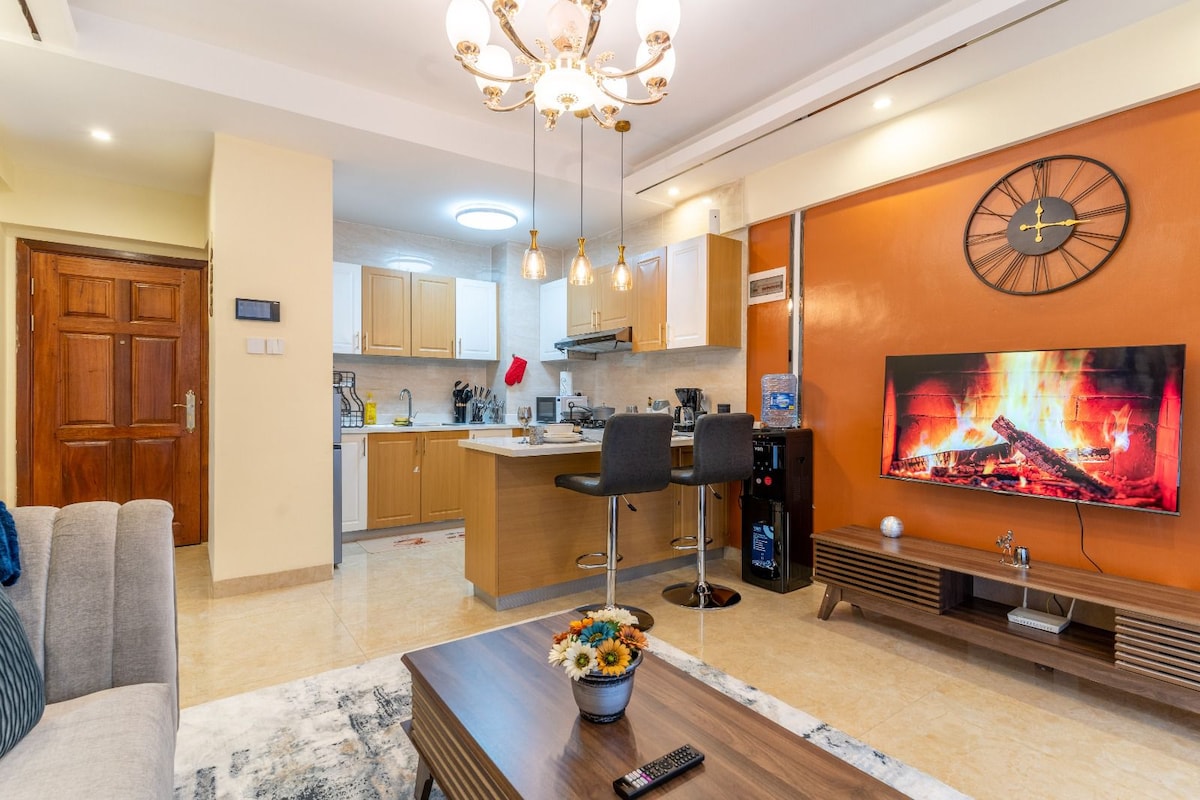 Discover this 2-bedroom, 1-bathroom apartment featuring an expansive living room. Equipped with comfy recliner seats, a 70’ smart TV, high-speed WiFi, and a washing machine. Enjoy nearby dining options and 24-hour hot water. Situated along Mbagathi Way, this apartment offers convenience to the city center, Wilson & JKIA airports, and Nairobi National Park. The building includes an elevator and windows that reveal the vibrant city skyline.
