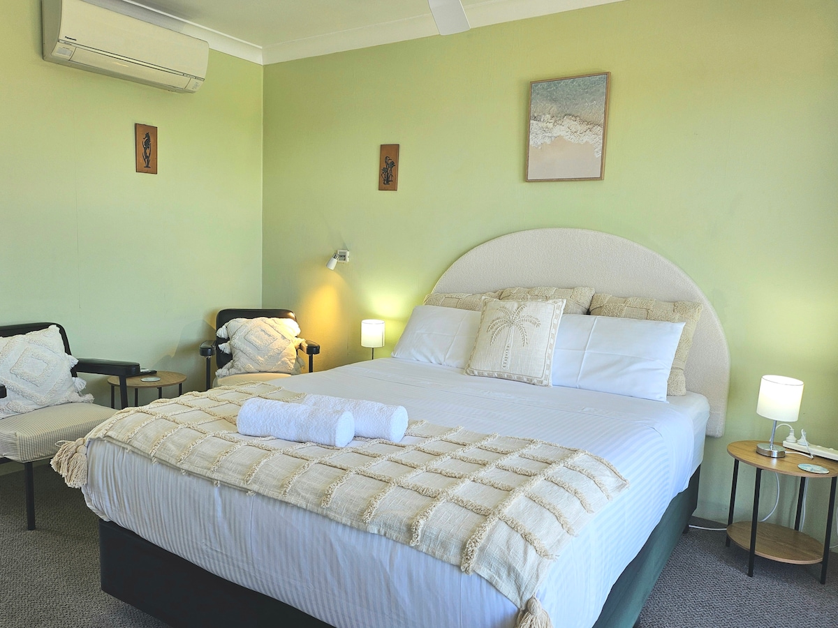Estamos ubicados justo en el centro de la ciudad, encima del icónico Milton Hotel, que fue construido en 1870 y reformado con cariño en 2019. Nuestra habitación panorámica es perfecta para una pareja o un viajero solo. Cuenta con aire acondicionado de ciclo inverso, con ebanistería hecha a medida localmente y bien equipada, con vistas a las verdes colinas de Milton y al punto de surf de Green Island. Dispone de utensilios para preparar té y café, así como un minibar y productos de baño Leif en el baño privado. Esta habitación cuenta con TV inteligente y NBN de alta velocidad, así que no olvides traer tu dispositivo.