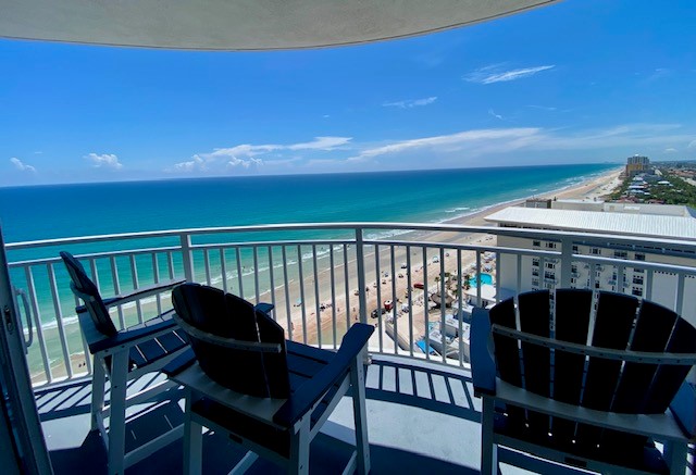 We are located on Daytona Beach a 1 minute walk through the pool area to be on the beach. You cannot beat this ocean view. This Studio has been completely remodeled in October 2024. Enjoy the new 75" TV and the oversized comfortable chair with ottoman. The table allows for dining and also for working. Spend time on the balcony overlooking the ocean and also with a view of our giant pool. It's the best place for people watching! Also enjoy many flocks of Pelicans flying by the unit each day.
