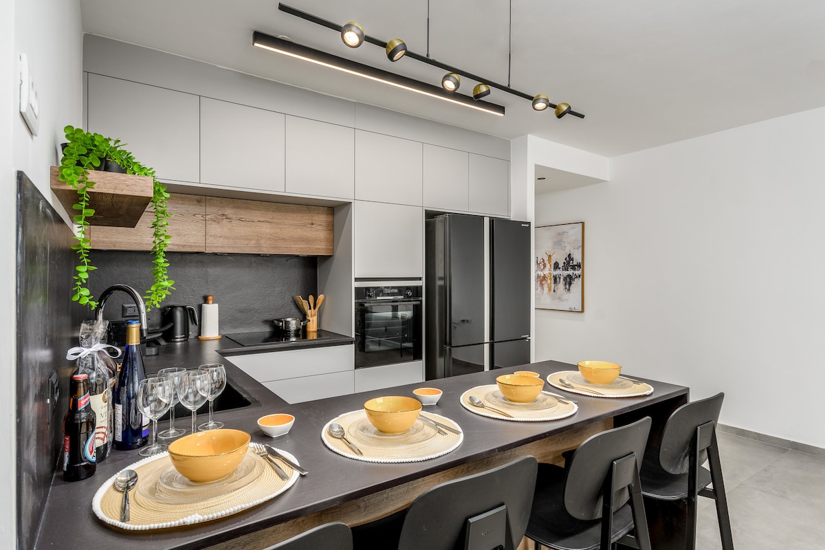 Este hermoso apartamento de 87 m2 tiene una cocina de concepto abierto a la sala de estar/comedor, dos dormitorios, 2 baños y un balcón con impresionantes vistas a Jerusalén. El departamento está decorado en muebles de alta gama para satisfacer todas tus necesidades... La cocina está totalmente equipada con refrigerador, horno, estufa, lavavajillas y horno microondas. En la sala de estar, puedes disfrutar de un cómodo sofá, así como un sillón encantador y una mesa de comedor con capacidad para 8 personas cómodamente.