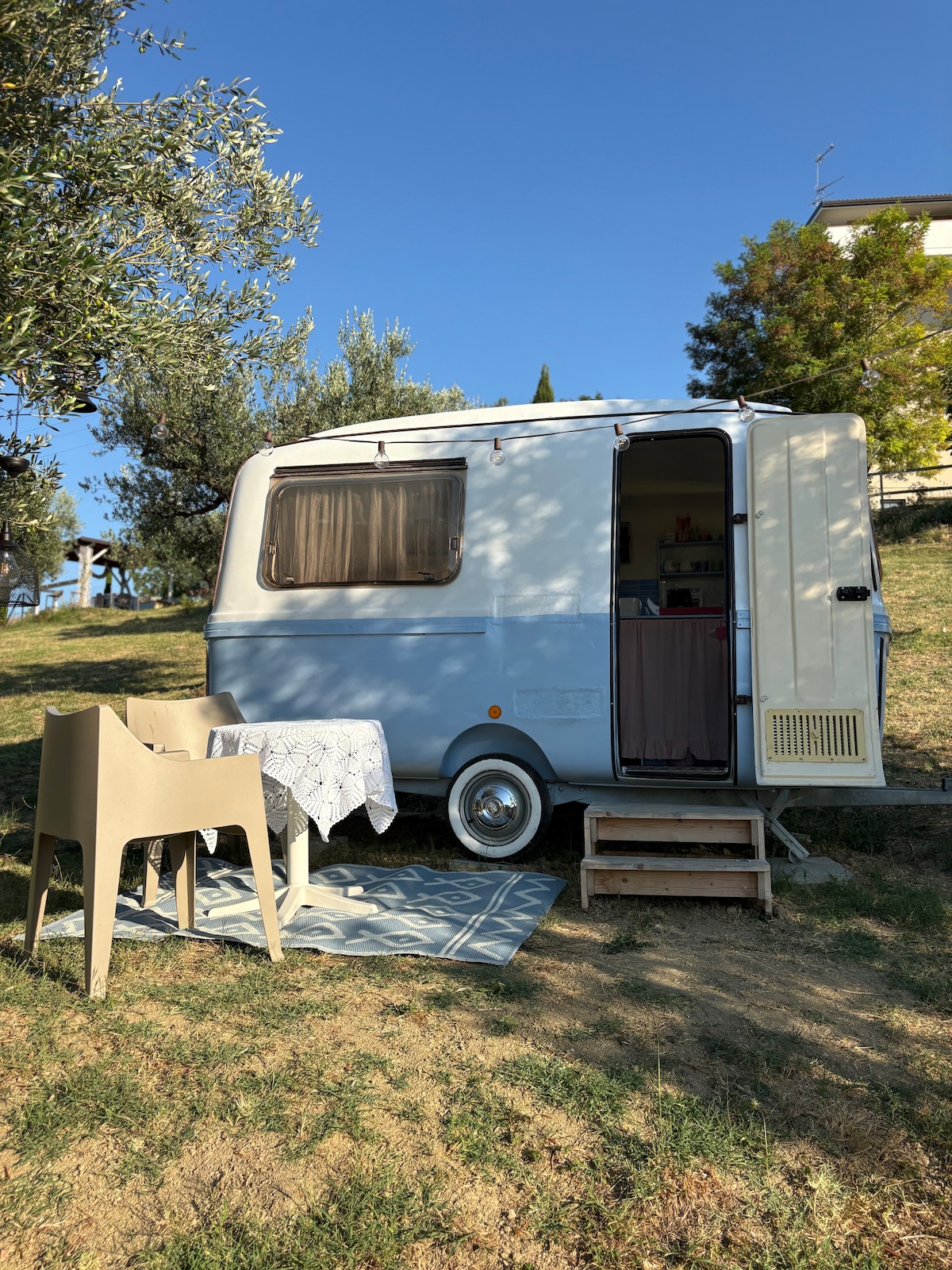 Experimenta el glamping en una caravana vintage inmersa en las colinas de Teramo, rodeada de olivos y a pocos kilómetros del mar. Nuestro Lander Graziella 340, cuidadosamente restaurado con nuestras propias manos, acomoda cómodamente a 2 personas en un ambiente romántico y relajante, tiene una cama francesa, una mesa con asientos, un fregadero y un rincón de desayuno con un hervidor y una máquina de café. También tiene una zona de relajación al aire libre, donde puedes disfrutar de la vista del valle.