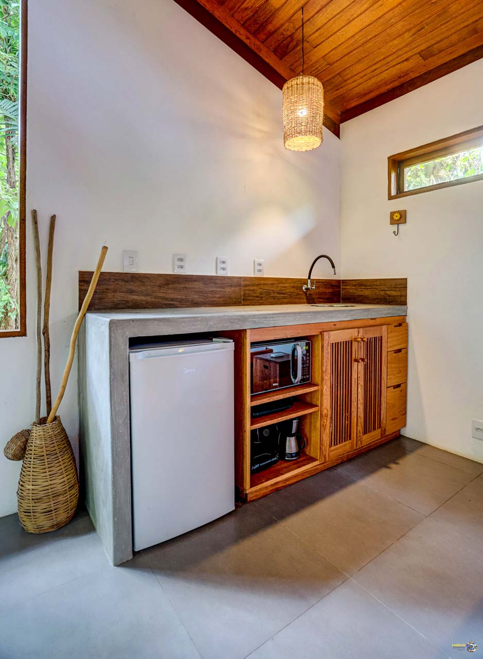 Un bungalow construido artísticamente en cada detalle... bañera abierta al bosque con techo de cristal dan la sensación de estar inmerso en la naturaleza, con una higuera centenaria al frente y muchas aves... íntimo y acogedor en conexión con la Naturaleza en contacto con esta zona de reserva de la Mata Atlántica. La otra ducha de hidromasaje está en la terraza abierta al bosque y es deliciosa de día o de noche con cielo estrellado y luna.
