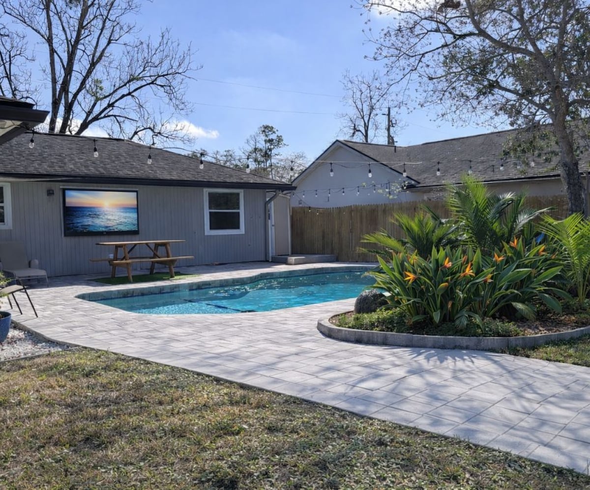 Nuestra cabaña con piscina está ubicada en una ubicación tranquila en la vía fluvial intercostera y es el lugar perfecto para estar cerca de la clínica Mayo (2 millas) o escaparse y relajarse. Edificio privado con gran dormitorio principal/sala de estar y baño privado. Patio trasero y piscina recién remodelados. Capacidad para 5 personas (1 tamaño king + 1 completo + 1 doble). Wifi 5G. Cargador EV 2. Cerca de playas (4 millas), restaurantes, millas; TPC/ Sawgrass Golf, 10 millas; Saint Johns Town Center compras 10 millas; Aeropuerto Internacional de Jacksonville, 25 min.