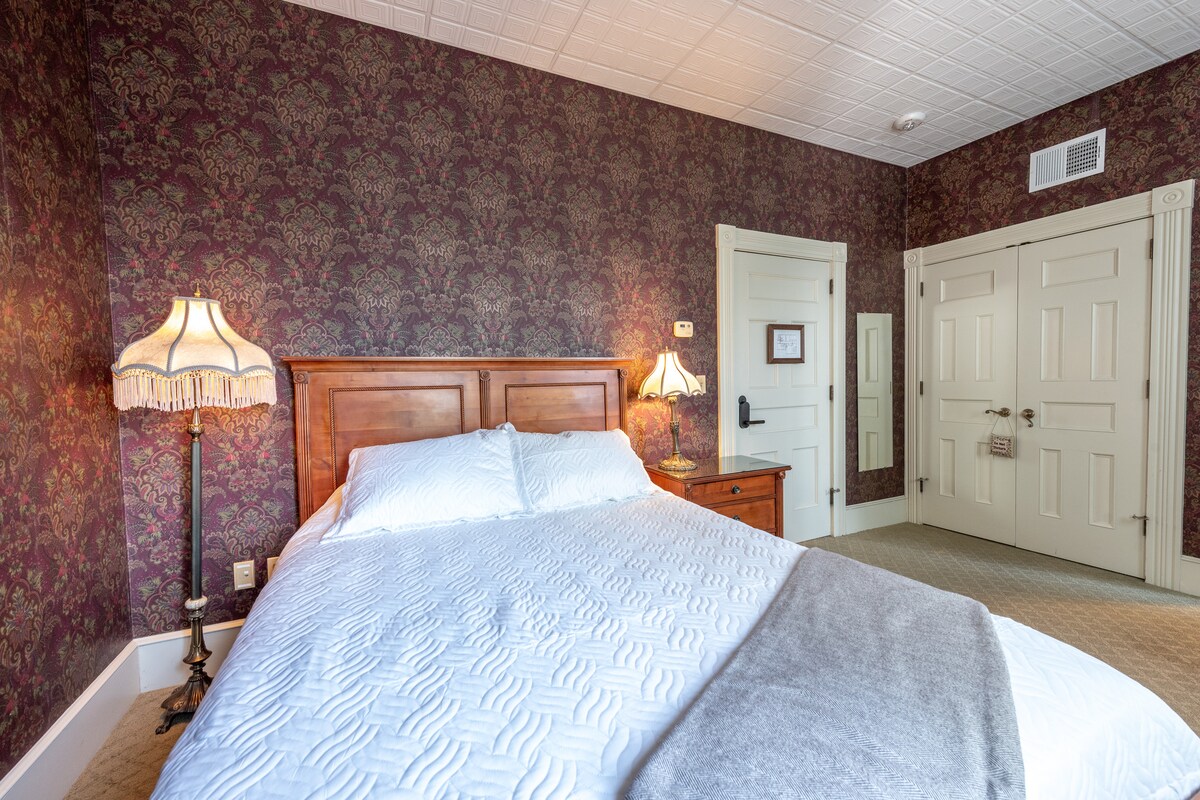 This private retreat invites you to experience a comforting solitude, enveloped in quiet serenity and thoughtful sophistication. Elegantly adorned with lovely wallpaper, the room houses a beautifully appointed queen-sized bed that promises a restful night's sleep. A full bathroom awaits, adorned with modern amenities to ensure your utmost comfort. It's not just a room; it's an experience offering a perfect balance of indulgence and comfort to ensure a sense of coming home.